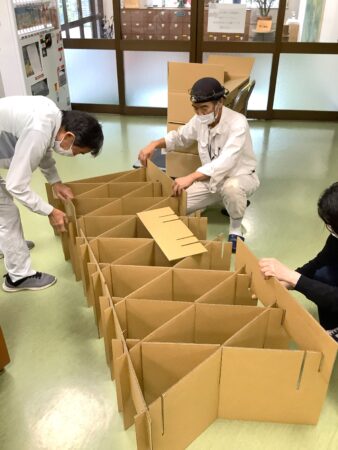 想像していたよりも段ボールベッドが硬く、実際寝る際には何か敷いた方が良いとわかりました。今まで施設に来園したことがない住民の方にも、興味をもって参加していただけました。