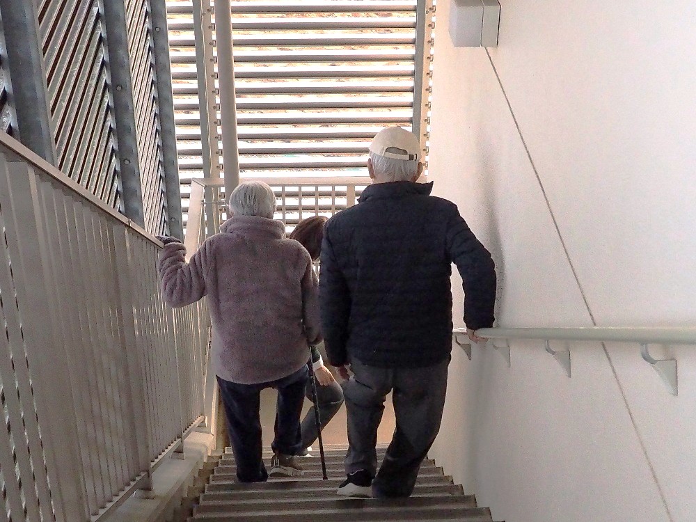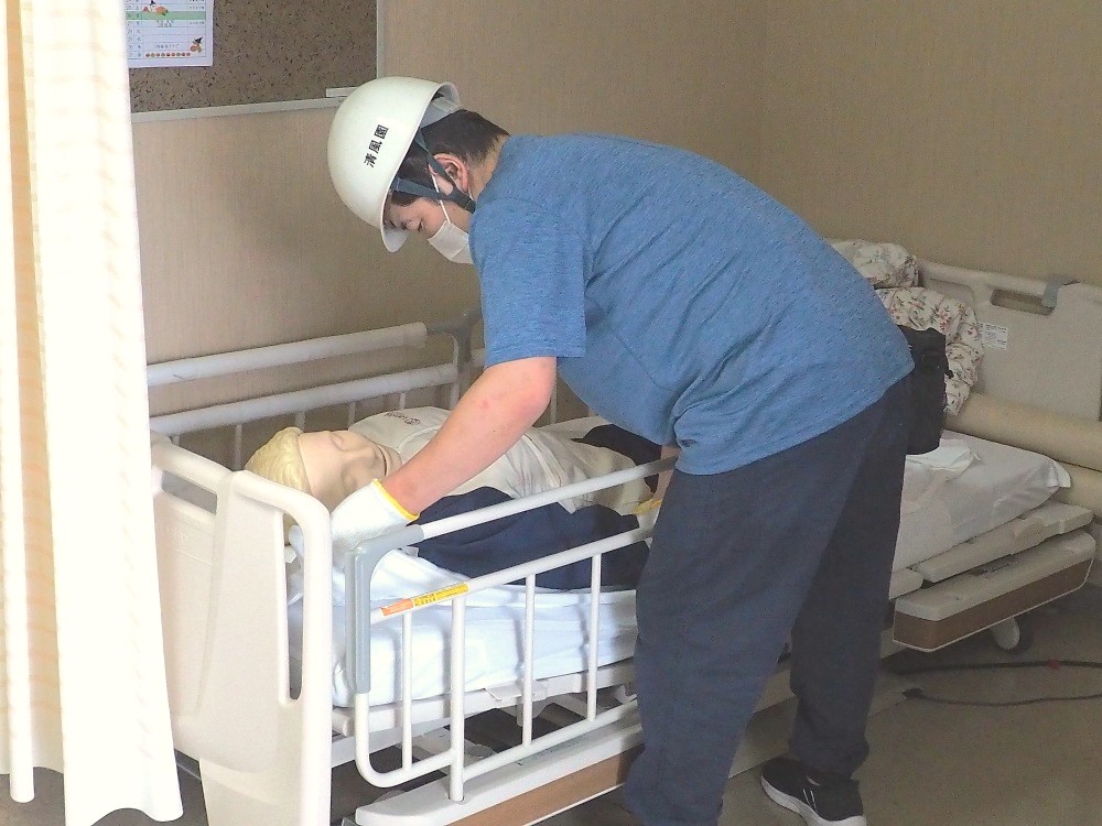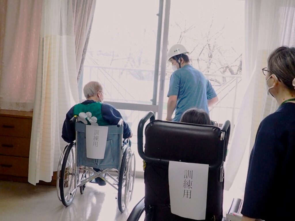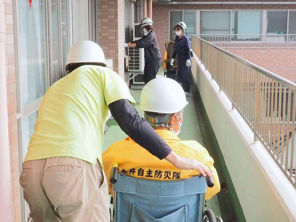今年度、初めて「森の丘自治会」と防災訓練を行うことができました。施設内に入るのも車いすを見るのも初めての方々であり、実際に、車いすにも乗って頂いて職員がベランダへ避難誘導をする際にご利用者役として参加して頂きました。