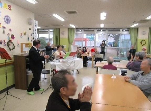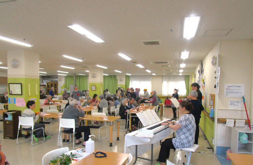 喫茶開催中は演奏団体に依頼し、楽器の生演奏を披露して頂いています。地域への周知として目黒区社会福祉協議会や北部包括支援センターの職員の方にも協力して頂き、声掛けや白寿荘で作成したチラシの配布をしていただきました。また11月から目黒区社会福祉協議会の職員さんの提案で「似顔絵コーナー」を作り、別の施設の利用者の方が画伯として、似顔絵を描いて下さっており好評です。喫茶以外にもイベントとして移動動物園を開催し、地域からも沢山の参加がありました。