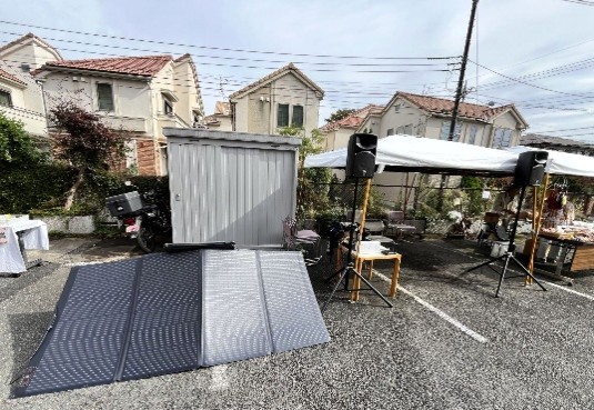 曇り空でしたがソーラーパネルで発電ができ、音響として使用したスピーカー分の電力をまかなうことができました。秋の開催ではありましたが、日差しが強くなる時間帯もあるため、災害時も電源として使用できることも確認できました。