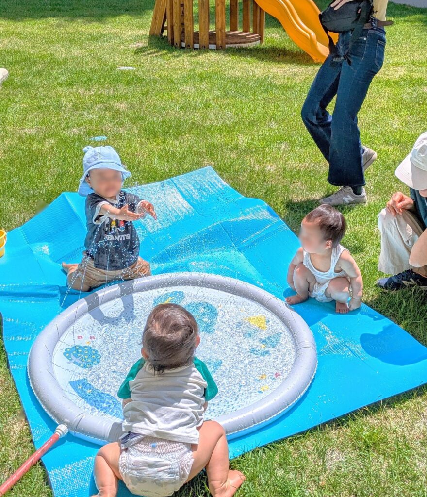 令和7年4月より、建て替え後の新しい場所で開催しています。ブロック、トミカ、プラレール、塗り絵、パズル、絵本、ぬいぐるみ、おままごとキッチン、おままごと、シルバニアファミリー、ドレス、ベビーカー、赤ちゃんのおもちゃなど準備しています。園庭では、お砂場、すべり台、ミニバイク、乗用ミニカー、 夏場は噴水プールなども準備し暑い夏を楽しみました。
