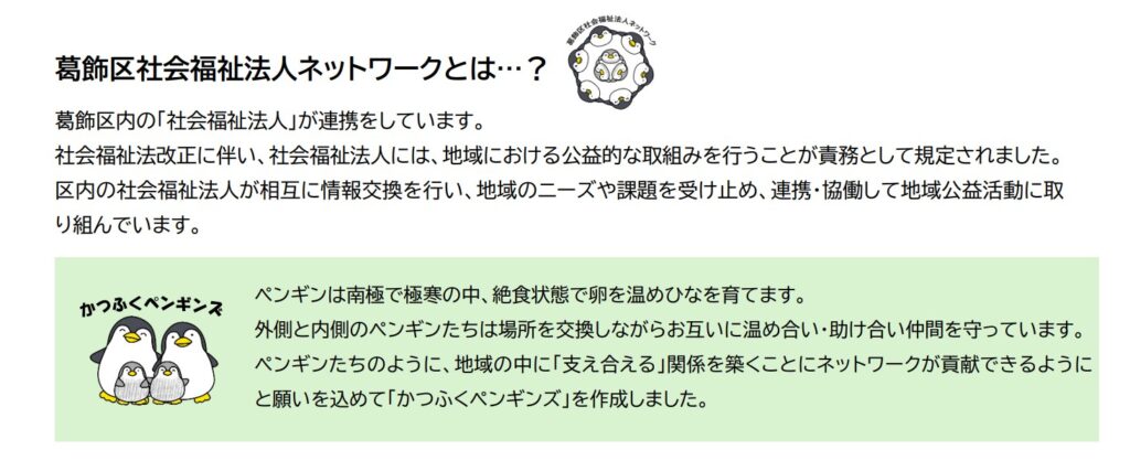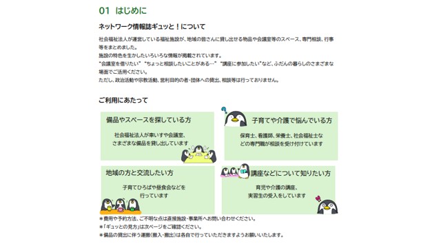 社会福祉法人が運営している福祉施設が、地域の皆さんに貸し出せる物品や会議室などのスペース、専門相談、行事等をまとめています。施設の特色を活かした情報が満載です。