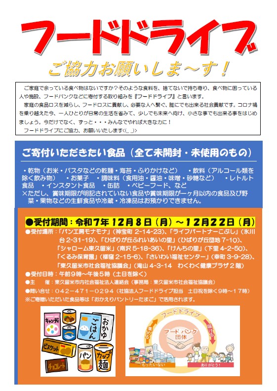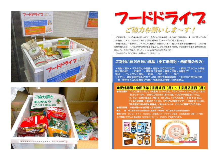 東久留米市内社会福祉法人連絡会内の社会貢献分科会が中心となって、社会福祉法人の強みを活かした活動について検討していたところ、市内のNPO法人が取り組むフードドライブ事業の一端(市民からの食品等のお預かりと保管、仕分け作業、運搬、広報等)を担うことができるのではないかと意見がまとまりました。